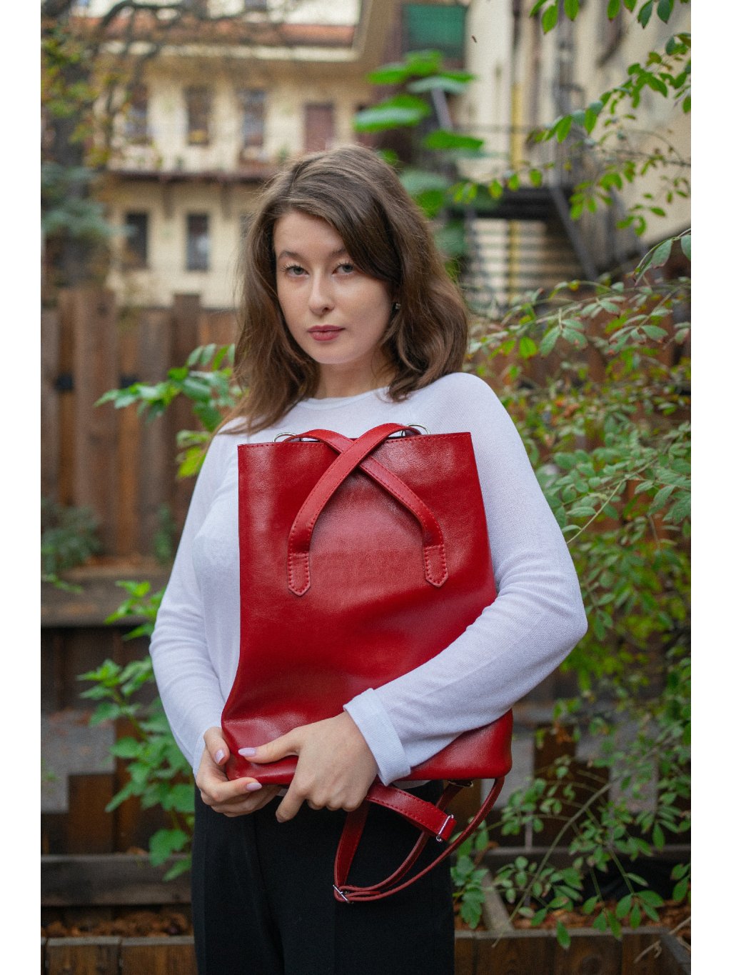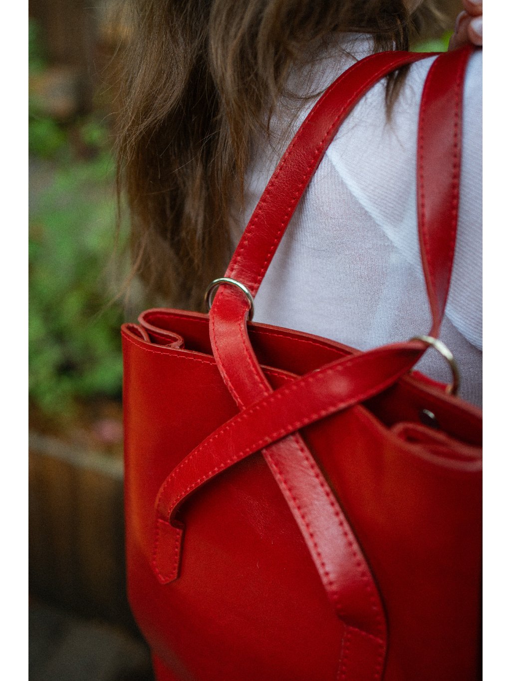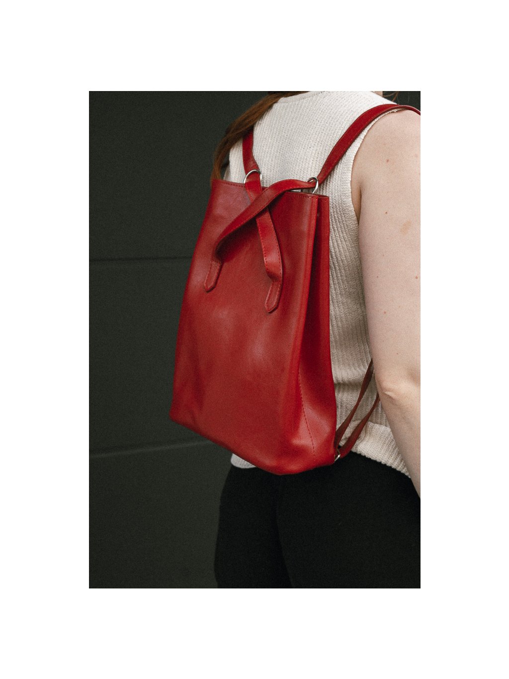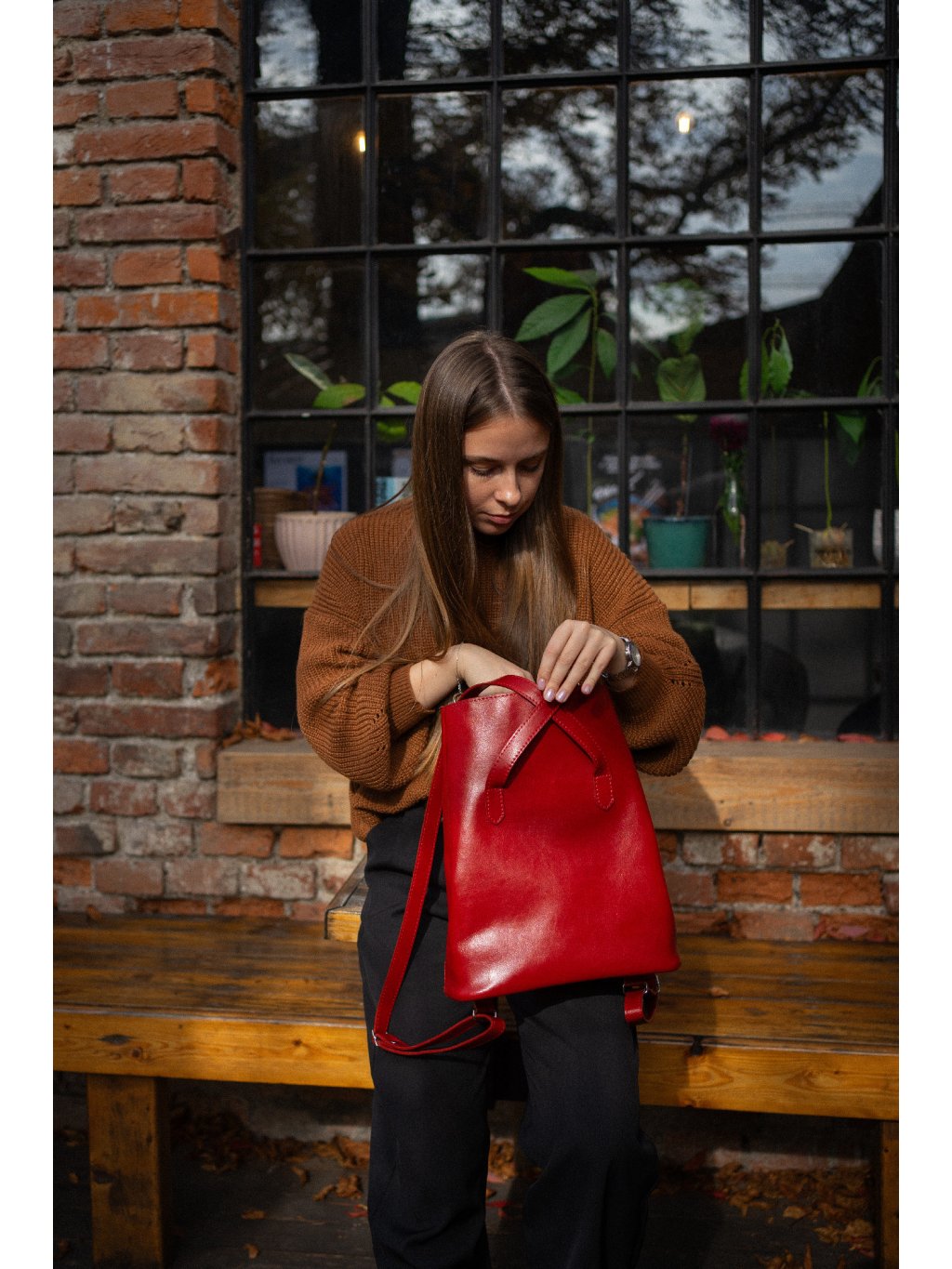 Kožený batoh a taška v jednom, má nastavitelné popruhy jak pro batoh tak i pro tašku. Vnitřek je vypodšívkovaný s kapsou na zip a má vyztužené dno. Barva krásná červená.