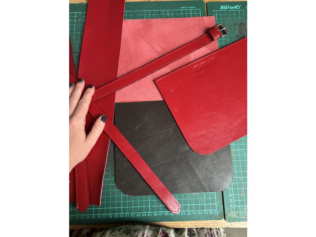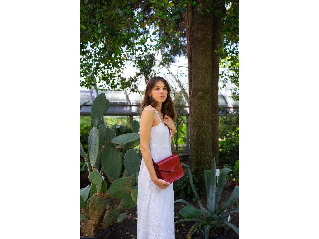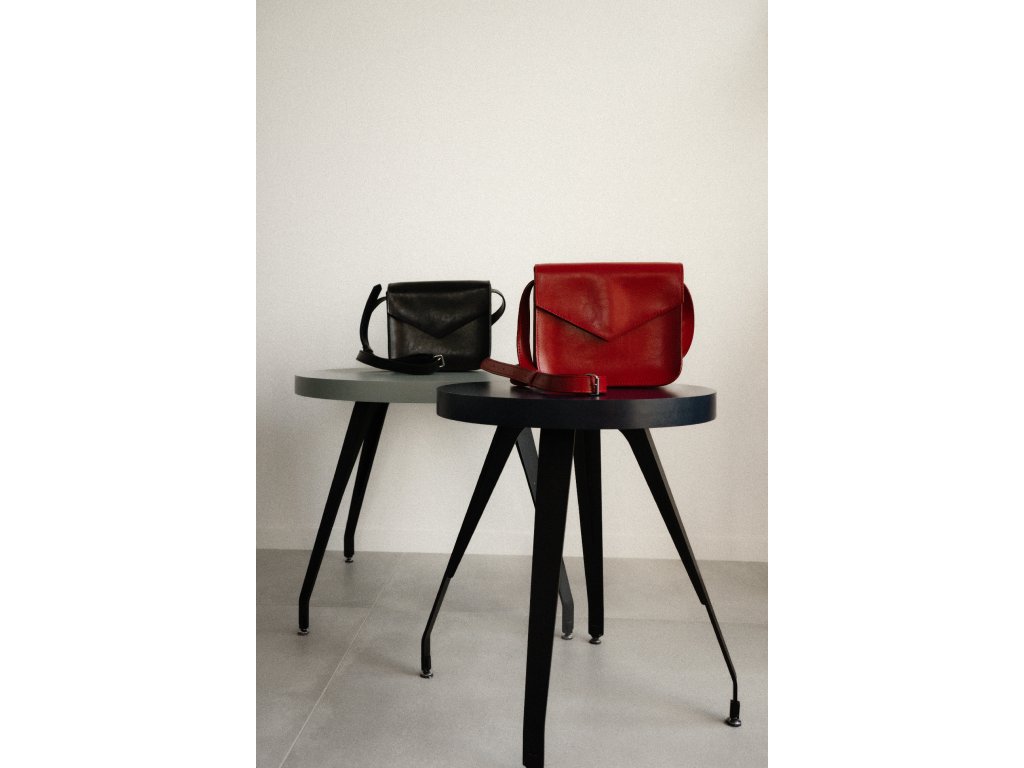 abelka je ušitá z hovězí kůže. Má nastavitelný popruh a zapínání na magnet. Stříbrná spona. Barva červená.