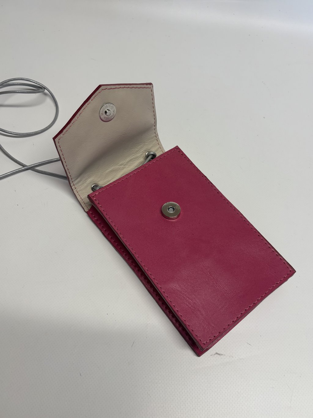 Celokožená malá kapsa na mobil a malé doplňky. Kožený provázek volitelné délky, nastavitelný. Zapínání na magnet.